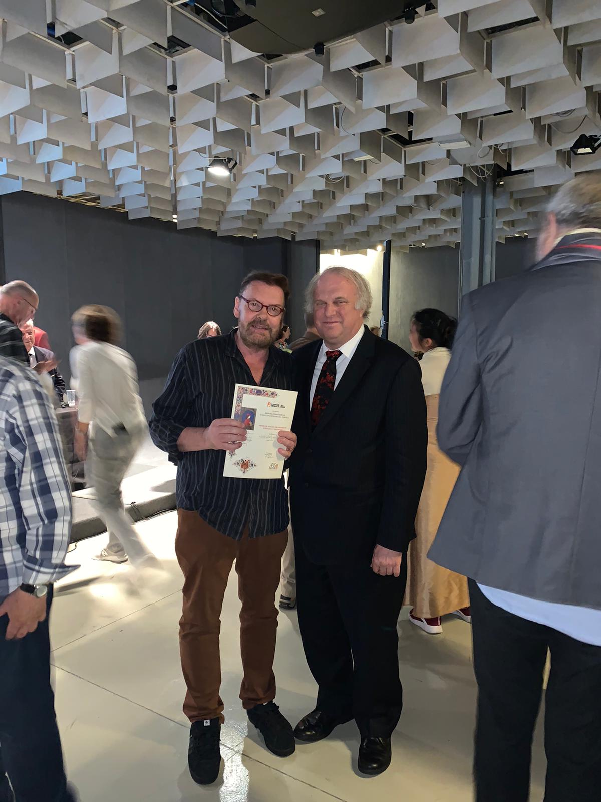 Wolfgang Hock bei seinen Bildern mit Urkunde und Medaille